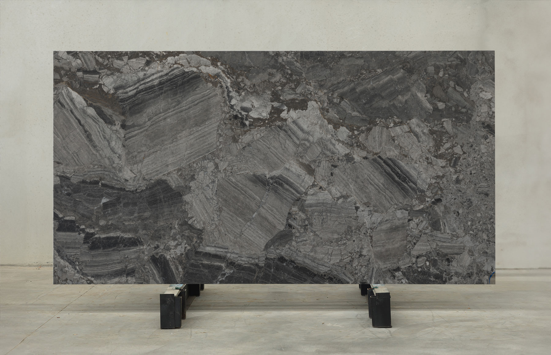 Derived from the quarries of Turkey, this spectacular Turkish stone conveys dynamism and flux from every angle. Shifting blocks of tonal and layered greys collide and seem to glide before our eyes, creating an effect of almost explosive