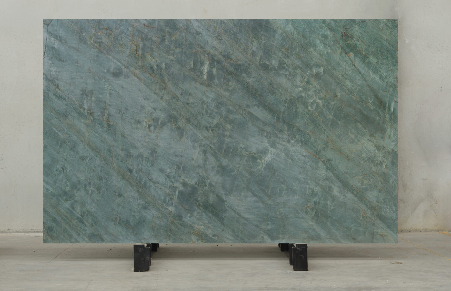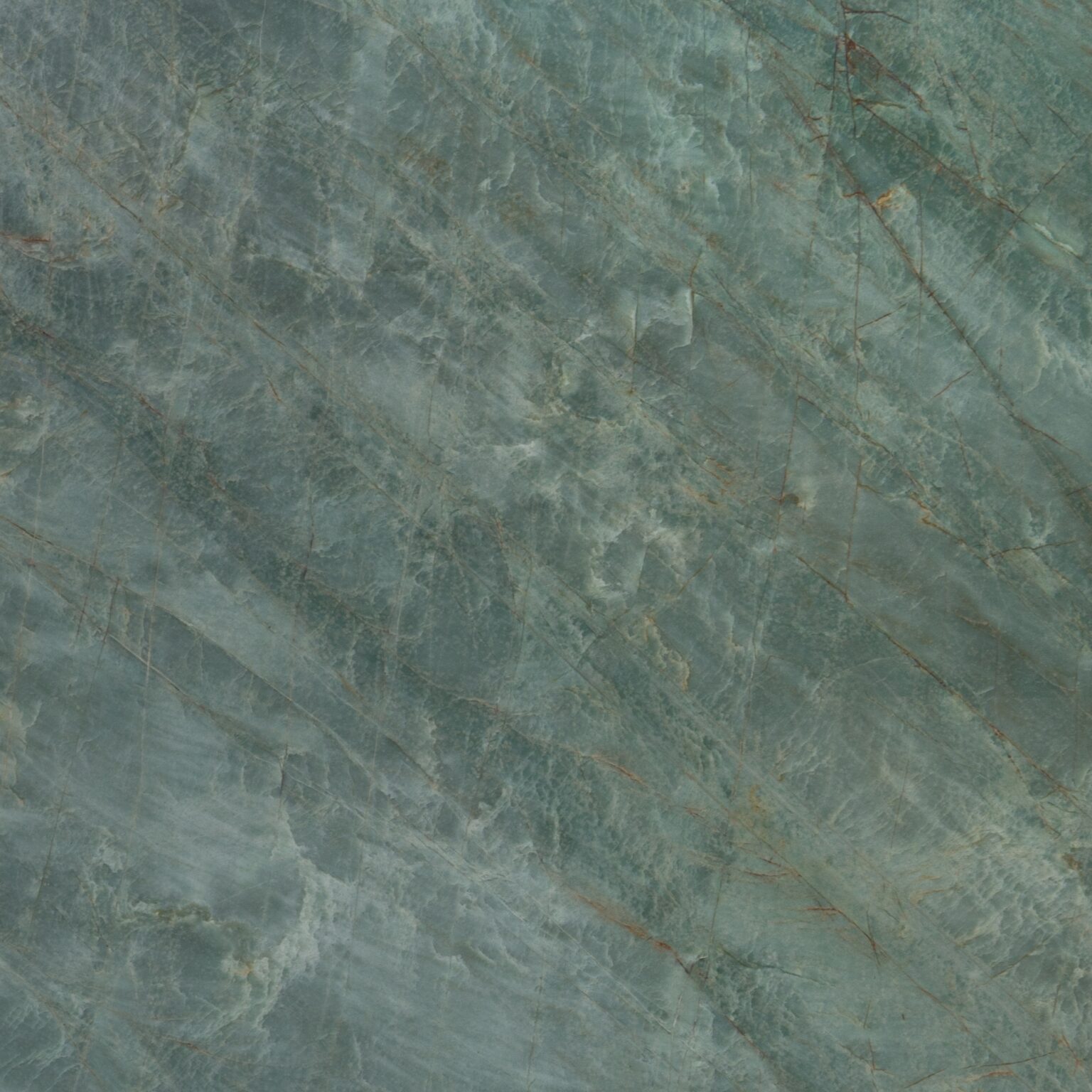 A muted green sets the tone. Emerald shadows and smoky gold fibres extend across the surface in long, mineral streaks, giving this Brazilian quartzite direction and presence.