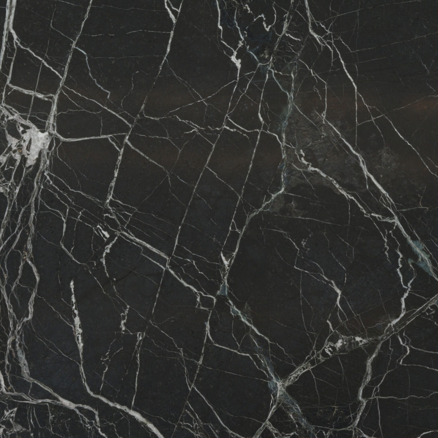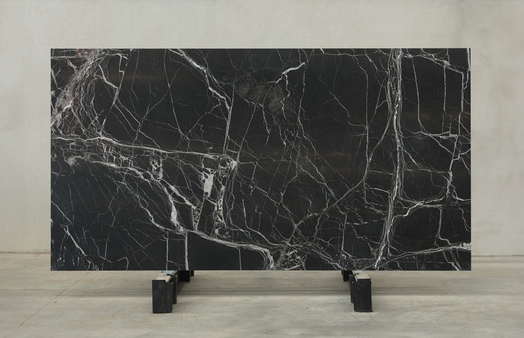 On a black base, white and emerald green veining create an array of crisp, brecciated fragments across the face of this stone, creating a distinctive ‘shattered’ effect that is its signature feature.
