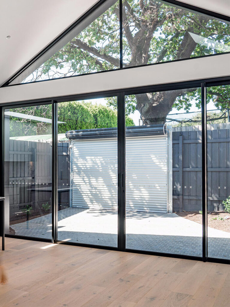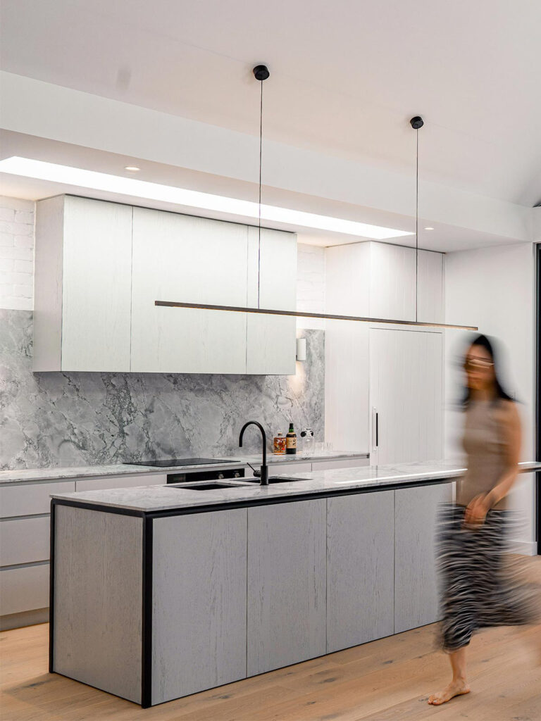 Super White stone was carefully selected for its ability to enhance the kitchen and living areas of this home. Its installation on the benchtop, splashback, and mantel hearth creates a seamless visual flow, complementing the cabinetry with a palette of ultra-white and tones of grey. Natural light dances through the glass windows and skylight, accentuating Super White’s distinctive patterns.